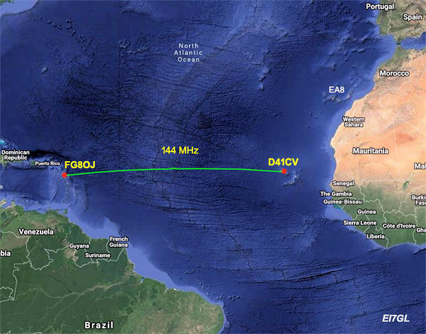 D41CV on Cape Verde Islands and FG8OJ in Guadeloupe spanned the Atlantic Ocean on 2 meters for the first time on June 16, according to reports. The distance was 3,867 kilometers (2,397.5 miles). The historic contact was made on 144.174 MHz using FT8 mode.