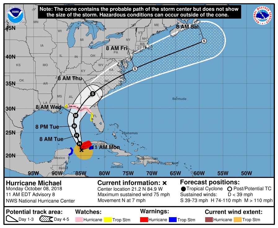 At 1200 UTC on Monday, October 8, Michael was some 120 miles east-northeast of Cozumel, Mexico, and about 70 miles south of the western tip of Cuba. Watches and warnings are already in effect for parts of Mexico and Cuba. In addition to the storm surge watch for sections of the Florida and Alabama Gulf Coast, a tropical storm watch is in effect from Suwannee River to Anna Maria Island, Florida, including Tampa Bay, and for the Alabama-Florida border to the Mississippi-Alabama border.